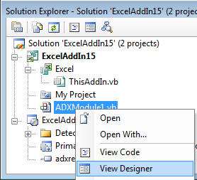 Add-in Express™ Add-in Express Home > Add-in Express for Office and VSTO > Online Guide > Add-in Express for VSTO components Add-in Express for VSTO componentsAdd-in Express moduleThe add-in module represents an add-in in the targeted Office application and centralizes all programming logics in one place. Its designer allows adding other Add-in Express components and setting their properties at design-time. It provides all events of the host application. It also supplies the OnStartupComplete and OnBeginShutdown events, so you can handle add-in startup and shutdown. There are also events related to Office 2010 and 2007 task panes (OnTaskPaneBeforeCreate, OnTaskPaneBeforeShow, OnTaskPaneBeforeDestroy, etc), and the Ribbon UI (OnRibbonBeforeCreate, OnRibbonBeforeLoad, OnRibbonLoaded). For Outlook add-ins, you can specify pages for the Tools | Options and Folder Properties dialogs. You can also add custom task panes in Outlook, Excel, Word, and PowerPoint, versions 2003, 2007 and 2010. See Advanced Custom Task Panes in Office 2003-2010. Adding an Add-in Express component to the Add-in Express designerTo add any Add-in Express for VSTO component onto the add-in module, activate the Add-in Express Module designer window and use commands available either in the Properties Window or in the context menu. To activate the Add-in Express Module designer window, in the Solution Explorer window, right-click on the Add-in Express Module item and choose the View Designer popup menu item.