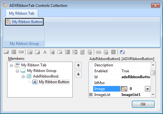 In the Properties window, run the editor for the Controls collection of the Ribbon tab component. In the visual designer, use the toolbar buttons or context menu to add or delete Add-in Express components that form the Ribbon interface of your add-in. First, you add a Ribbon tab and change its caption to My Ribbon Tab. Then, you select the tab component, add a Ribbon group, and change its caption to My Ribbon Group. Next, you select the group, and add a button group. Finally, you select the button group and add a button. Set the button caption to My Ribbon Button. Use the ImageList, Image, and ImageTransparentColor properties to set the icon for the button.